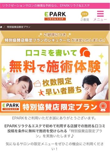 こんにちは。たまたまお得情報を見つけたので今日は1日に2回の更新です^^; ポイントサイトのEPARKリラク&エステ案件が超お気に入りなので、またマッサージを受けに行こうとサロンを探していたら、口コミを書くことを条件に無料で施術できるプラン特…